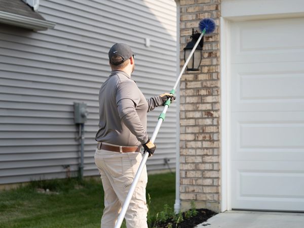 We don’t just de-web the eaves. We hit everywhere webs and wasp nests are likely to be; Eaves, Doors, Windows, Downspouts, etc. Quite frequently webs can only be seen when the light shines on them just right, so we hit these areas whether or not the webs are visible, just to be safe.